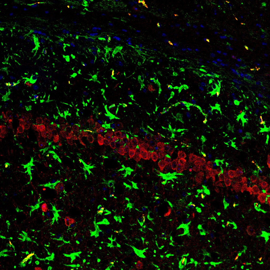 The image shows in red, the neurons of the hippocampus, in blue, all cells which are in this part of the brain and in green, cells called astrocytes which are in high density and are responsible for the observed increase in neuroinflammation.