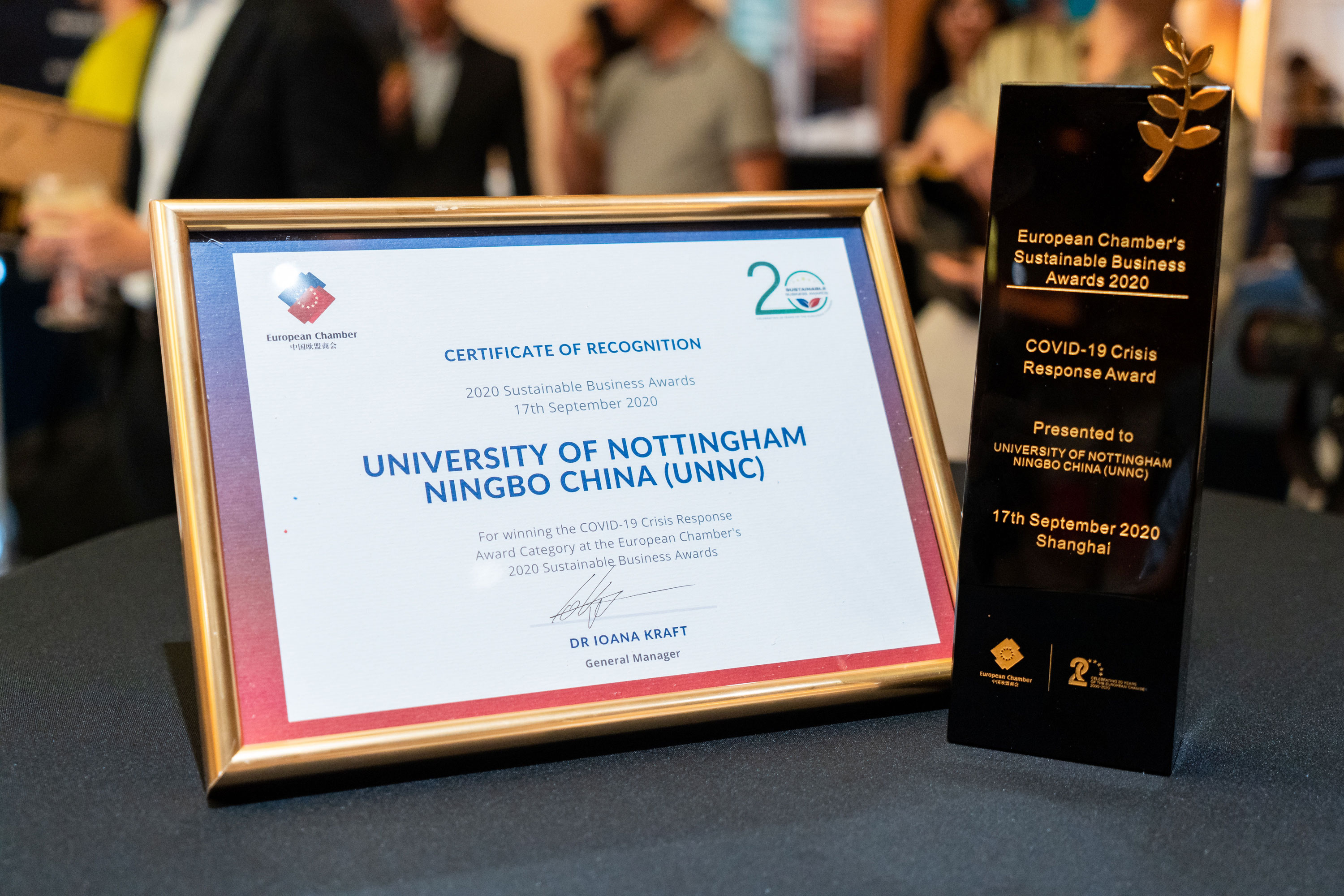 The University of Nottingham Ningbo China (UNNC) has been recognised for its response to the COVID-19 pandemic with an award from the European Chamber of Commerce in China.