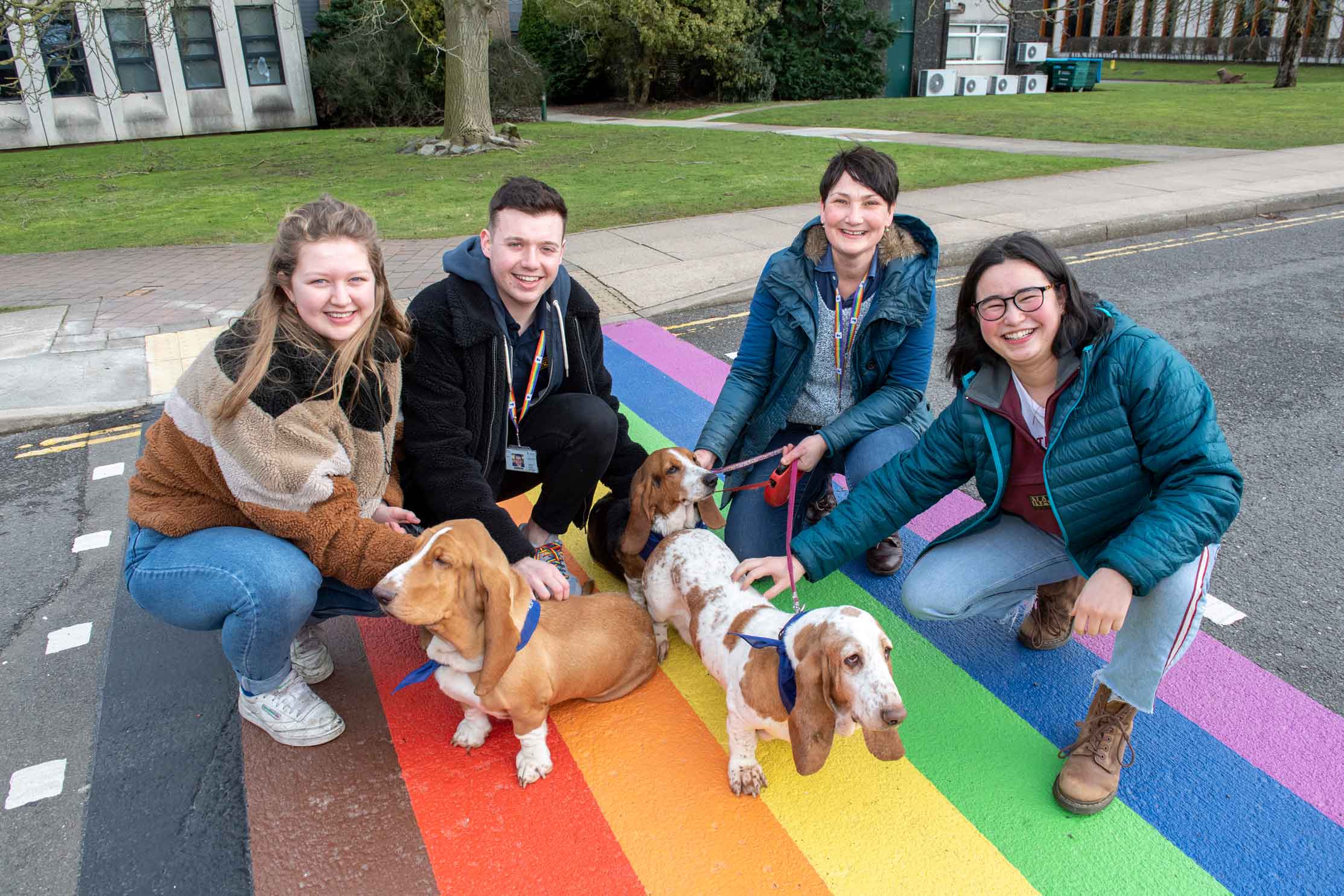 The University has most recently installed a rainbow outside the Gateway Building on its Sutton Bonington campus, and students and staff from the School of Veterinary Medicine and Science were joined by some four-legged friends, to mark the occasion.