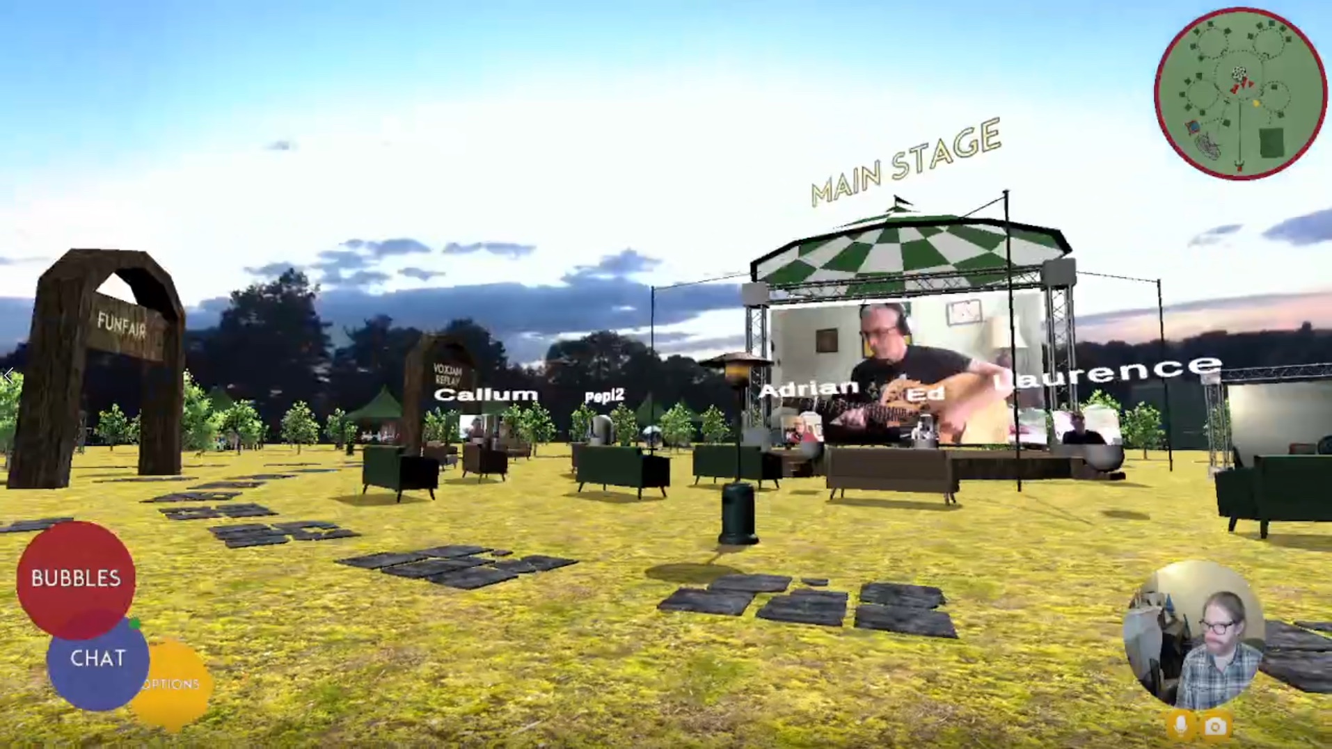 We have aimed to create a unique online festival experience of being able to explore a site, chat with friends and family, while also feeling part of a crowded audience. We want to take the online experience beyond staring at flat screen of video windows, here you are part of a crowd exploring a festival world where you can find stages and sideshows and meet other people as you go.
