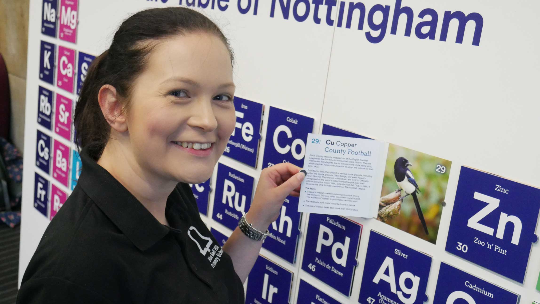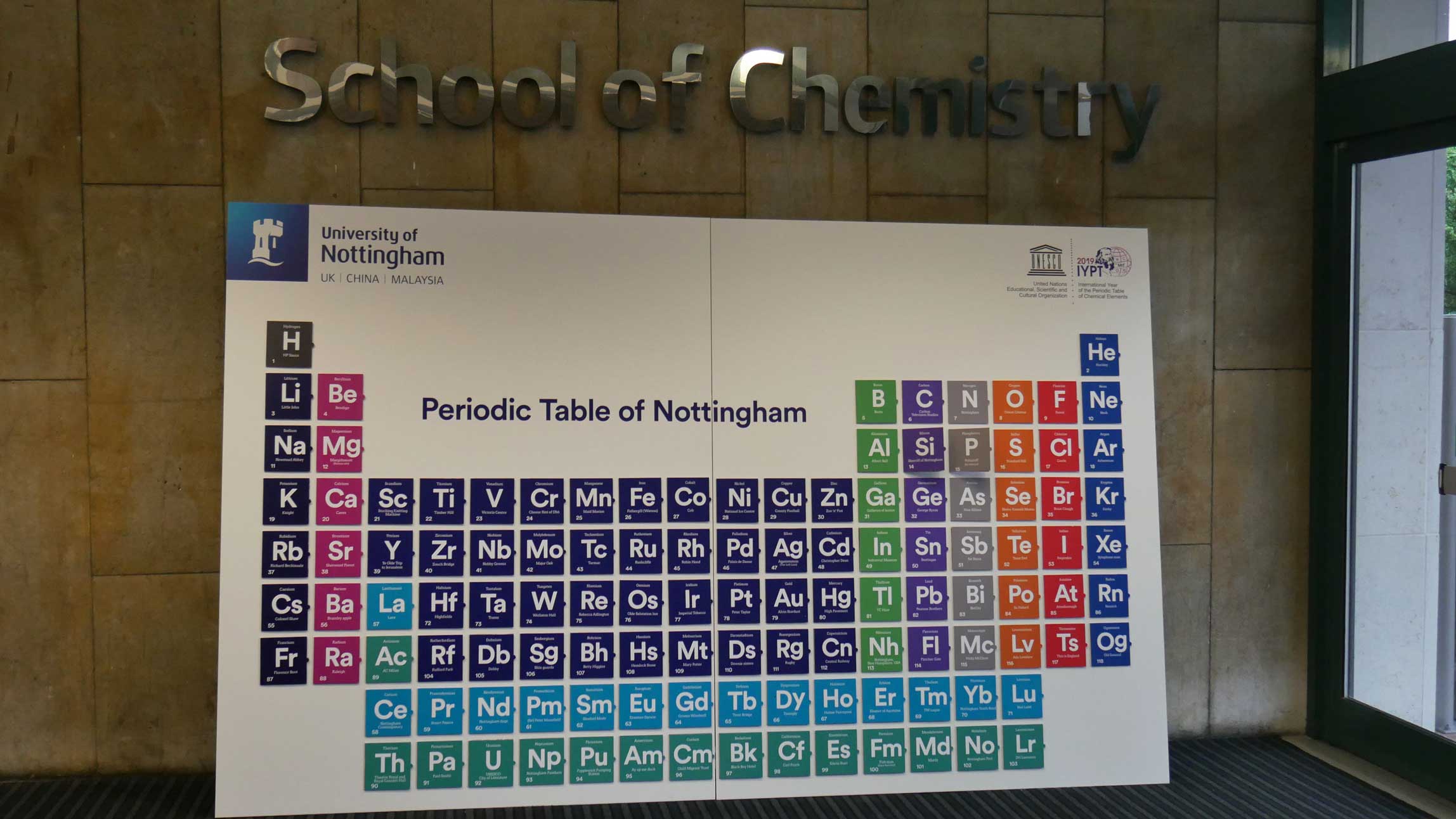 A huge freestanding version of the Periodic Table of Nottingham is in the chemistry building and features an interactive advent calendar style design with the Nottingham and chemical elements on the outside with doors that can be opened to reveal facts about the chemical element and the Nottingham replacement. An online version will also be on the university website from June 15.