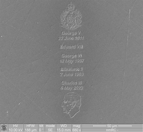 The names and coronation dates of all the Windsor monarchs (dating back to George V in 1911) have been etched onto an uncirculated 50p coin. This was acheived using a technique called Focussed Ion Beam Scanning Electron Microscopy (FIB-SEM) and was conducted by Dr Nigel Neate on the FEI Quanta3D FIB-SEM. The width of the inscription is approximately 30 microns which is about the same size as a white blood cell.