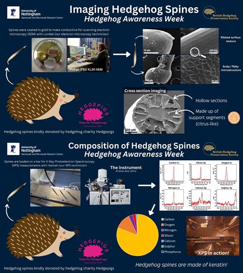 Hedgehog Awareness Week, organised by the British Hedgehog Preservation Society, takes place from 30th April to 6th May and a team at the Nanoscale and Microscale Research Centre (nmRC) have decided to raise awareness of this important week by studying hedgehog spines. The spines were kindly donated by Deborah Korn from local hedgehog rescue charity Hedgepigs (www.hedgepigs.org) and they were studied using scanning electron microscopy (SEM) by Lorelei Robertson (Electron Microscope Technician) and x-ray photoelectron spectroscopy (XPS) by Dr Hannah Constantin (XPS Technician and founder of UoN Hedgehog Friendly Campus Group) to understand their microstructure and composition respectively. The results were collated together to create some educational resources such as the posters shown here.