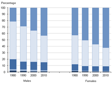 The proportion of UK deaths registered to those aged 80 years or over has risen from 21 per cent for males and 43 per cent for females in 1980 to 43 per cent and 62 per cent respectively in 2010.