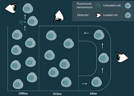 Diagrammatic representation of offline, online and inline measurements permitted with the aid of optical fluorescent nanosensors.