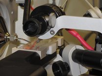 DESI is a combination of electrospray (ESI) and desorption (DI) ionization methods applied to a surface. A fine aerosol is generated by a jet of nitrogen around a microlitre/min flow of solvent mixture. The charged electrospray mist is applied at close range (mm) to the surface. After ion desorption from the surface, the ions travel at atmospheric pressure to the mass spectrometer interface which is an adapted transfer capillary. The Omnispray 1D and 2D (Prosolia) sample stage control can be automated for fine control in either 1 or 2 dimensions. Further software can used to create maps locating the source of ions detected. These interfaces are used in as inlets for either the Exactive or Velos MS systems.