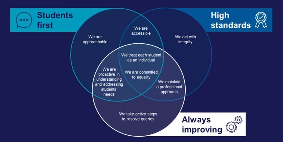We enable students to experience transformative learning by managing and supporting their academic journey, delivering services that enable them to realise their potential and achieve their goals'.