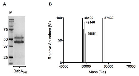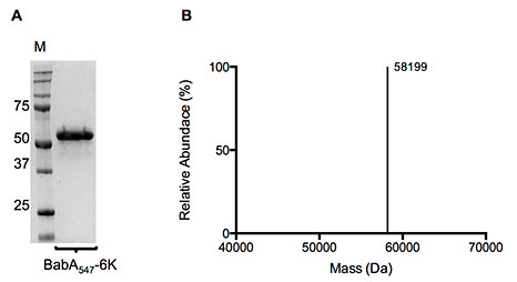 Figure 3. (A) Coomassie stained SDS-PAGE gel and (B) Molecular mass profile of purified BabA547-6K. IMAC and SEC purified BabA547-6K was used for both SDS-PAGE and liquid chromatography–time-of-flight mass spectrometry.