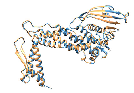 Figure 5: Superimposition of BabA from apo- and co-crystal structures. No global conformational change occurs in BabA (sandy brown) after Leb complex formation (steel blue) - RMSD = 0.25Å for all Cα atoms.