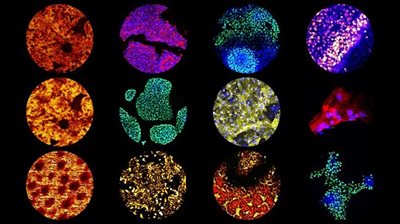 Article image: Human pluripotent stem cell expansion and differentiation on microscopic spots of polymer chemistries.