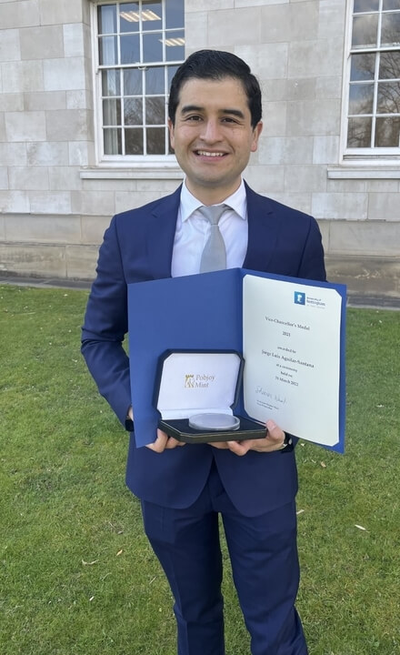 Jorge Luis Aguilar Santana member of the Buildings Energy and Environment Research Group has been awarded with the Vice Chancellor’s Medal 2021. He holds a PhD in Sustainable Energy Technology and has published several journal articles as part of his project "novel thin-film photovoltaic vacuum glazing".