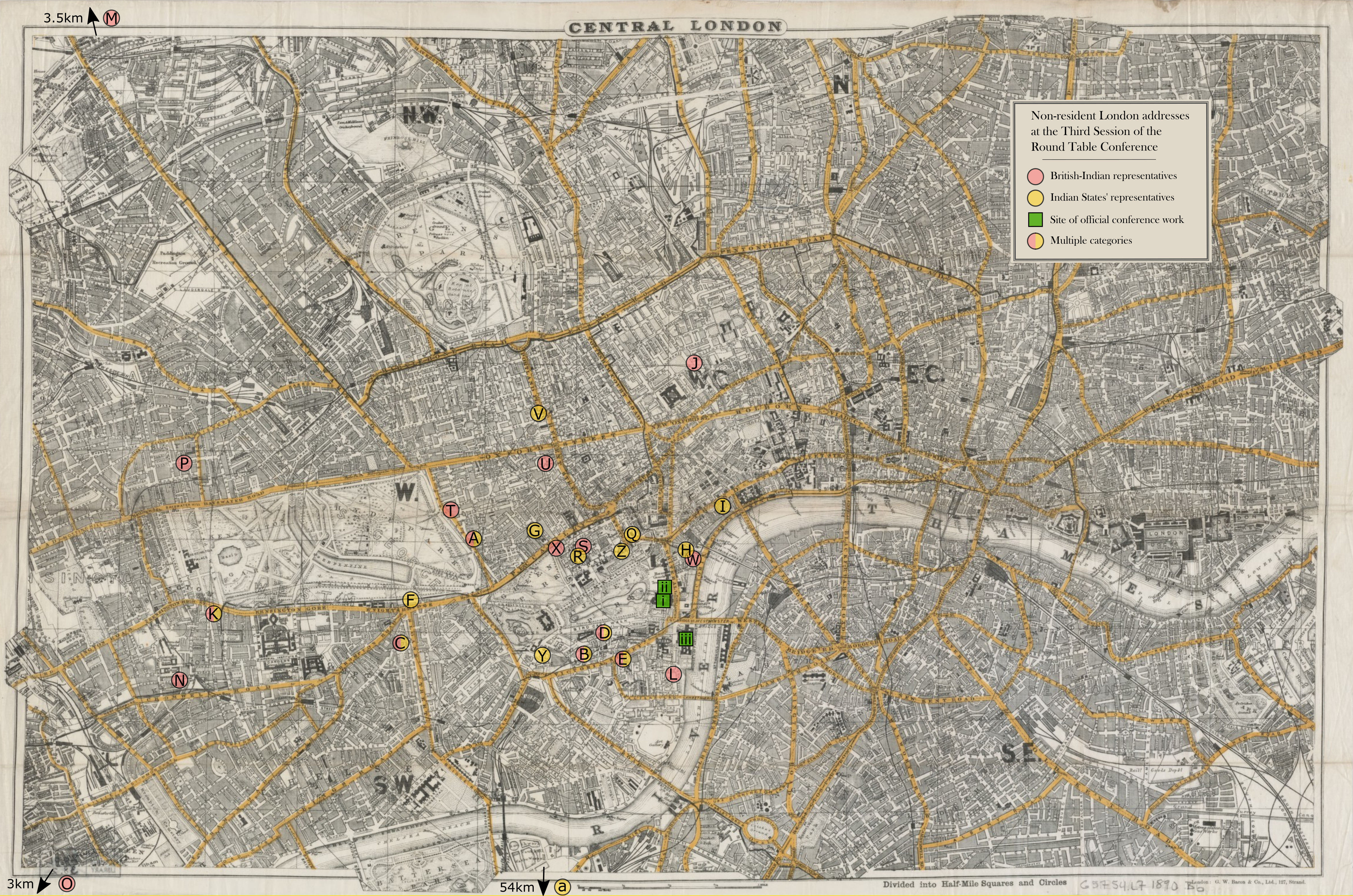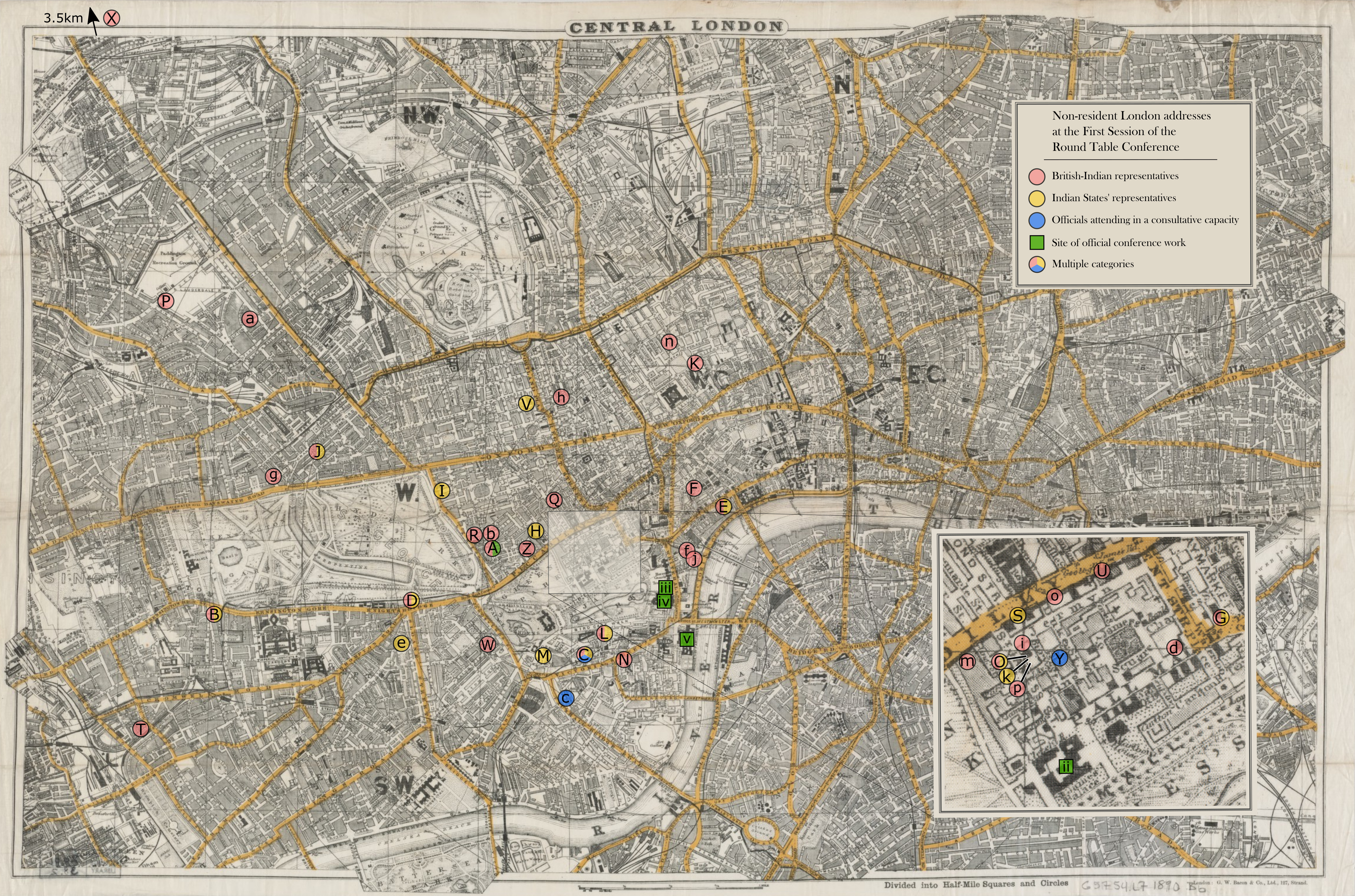 | Map code | Address | British-Indian Representatives | Indian States' Representatives | Officials attending in a consultative capacity |