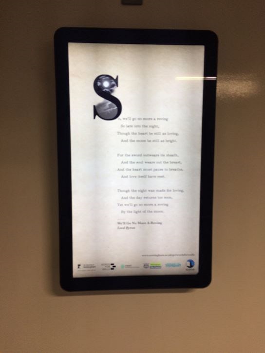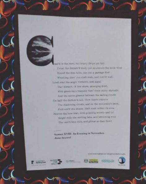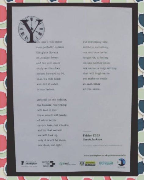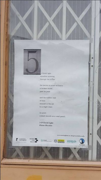 Poems are now on display in exciting locations across Nottingham, such as Broadway Cinema, Nottingham Contemporary, the Malt Cross, The Worm That Turned, A Room with a Brew, Bromley House Library, Creative Quarter Nottingham, Five Leaves bookshop, UoN Libraries, & THiNK!