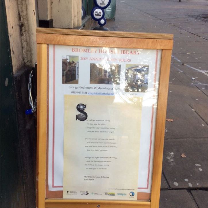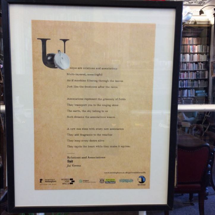 Poems are now on display in exciting locations across Nottingham, such as Broadway Cinema, Nottingham Contemporary, the Malt Cross, The Worm That Turned, A Room with a Brew, Bromley House Library, Creative Quarter Nottingham, Five Leaves bookshop, UoN Libraries, & THiNK!