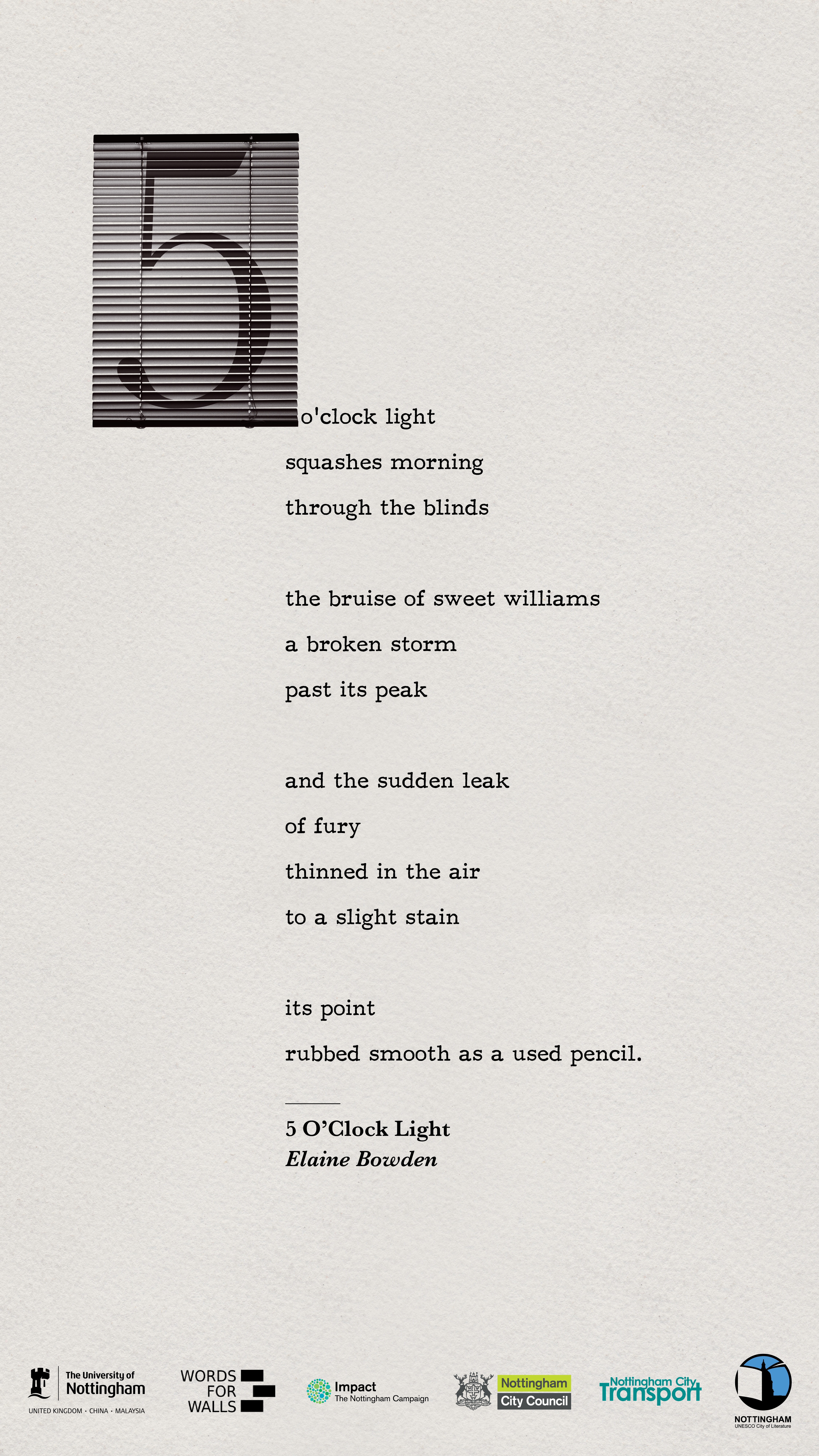 A huge thank you to Kathryn Towler at the University of Nottingham, who has designed a beautiful set of posters featuring these selected poems, which can now be seen in a number of exciting locations across Nottingham, including Broadway Cinema, Nottingham Contemporary, and Bromley House Library, to name just a few!