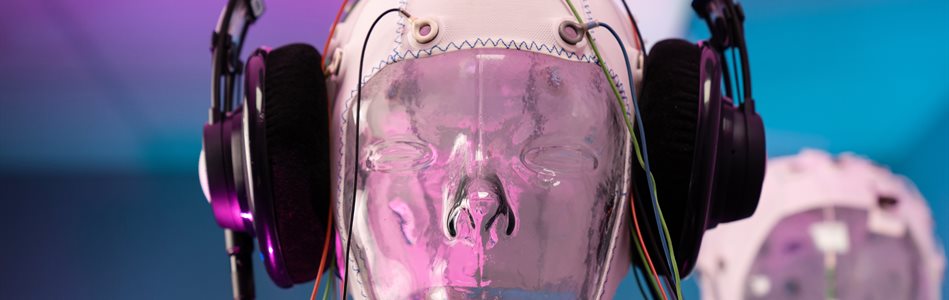 Two glass heads, one with an electrode cap and headphones, the other behind with electrode cap