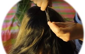 A person cuts some hair from the back of a person's head