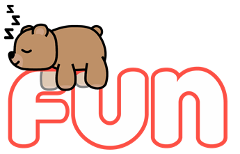 A cartoon teddy bear sleeps on the word FUN in red-rimmed letters