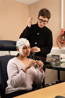 A researcher with a participant wearing an electrode cap