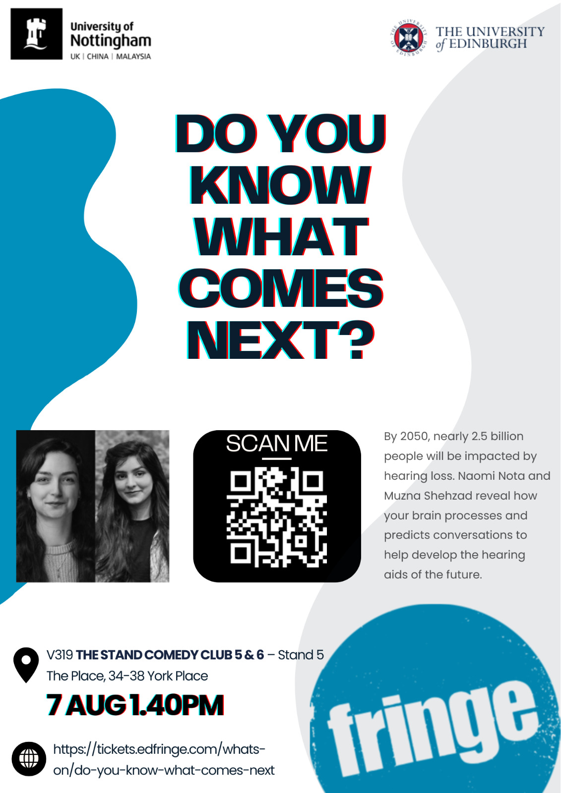 This year, we decided to take our project, running in collaboration with the University of Edinburgh, to the CoDi show at the Edinburgh Fringe Festival 2024. Our research focuses on the prediction of speech, i.e., how we anticipate what somebody will say next, hence the show’s title: ‘Do you know what comes next?’. Our work specifically looks at different stages of prediction: the fast and automatic early stage and the slower and more cognitively demanding later stage. We explore these issues in difficult listening conditions, ranging from increased background noise to hearing loss, both of which we included in our CoDi performance. We use eye-tracking in our research studies, specifically the Visual World Paradigm, which is why an eye costume was a special part of our CoDi performance.