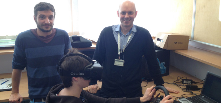 Davide Salanitri and Dr Glyn Lawson demonstrate the Oculus Rift VR kit to a product design student.