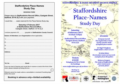 Join us at the Staffordshire Record Office for a study day introducing an exciting new volunteer project on Staffordshire place-names, run by the Record Office and the Institute for Name-Studies. Jayne Carroll, John Baker and Rebecca Gregory from the INS will be giving talks, as well as Dr Nigel Tringham, County Editor for the Victoria County History of Staffordshire.