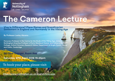The biennial Cameron lecture is held in memory of Professor Kenneth Cameron. Cameron was Head of English at the University of Nottingham from 1984 to 1987, and was one of the leading figures in place-name study. In 1967, he became Director of the Survey of English Place-Names and moved the library and offices of the English Place-Name Society to Nottingham, where they remain, now housed in the Institute for Name-Studies. This year’s lecture is being held to coincide with the annual conference of the Society for Name Studies in Britain and Ireland.