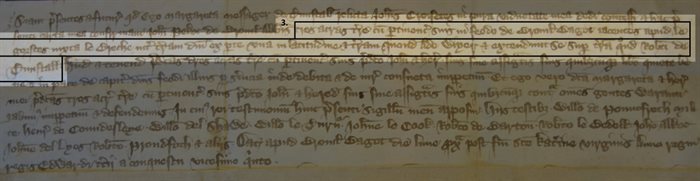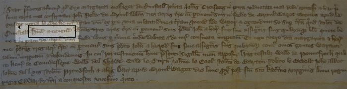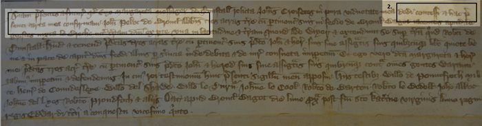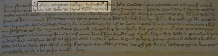 The images below will help you to navigate your way through a typical medieval conveyance charter in order to locate the section most likely to contain field-names.