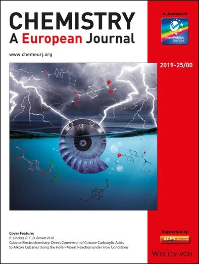 PhotoElectro's publication, "Cubane Electrochemistry: Direct Conversion of Cubane Carboxylic Acids to Alkoxy Cubanes Using the Hofer-Moest Reaction under Flow Conditions," was featured on the cover of Chemistry a European Journal (photo above).