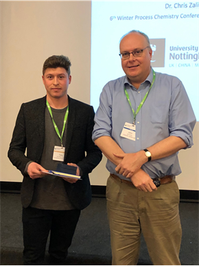 Toby Waldron-Clarke, a PhD student at the University of Nottingham, was awarded the Young Chemist Award and presented at the 6th Winter Process Chemistry Conference in Birmingham, UK. (photo above)