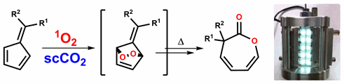 The PhotoElectro Team published, “Photooxidation of Fulvenes in a Continuous Flow Photoreactor using Carbon Dioxide as a Solvent”, L. Wu D. S. Lee, H. Boufroura, M. Poliakoff and M. W. George, ChemPhotoChem, 2018, 2, DOI: 10.1002/cptc.201800033. (photo above)