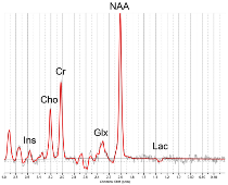 In MR spectroscopy the MRI scanner gives us a so-called MR spectrum instead of an image. A MR spectrum contains a number of peaks each of which belongs to a different chemical substance in the brain. With MR spectroscopy we hope to identify potential chemical imbalances in children with A-T. Such imbalances could be monitored in future treatment therapies to see if a treatment works.