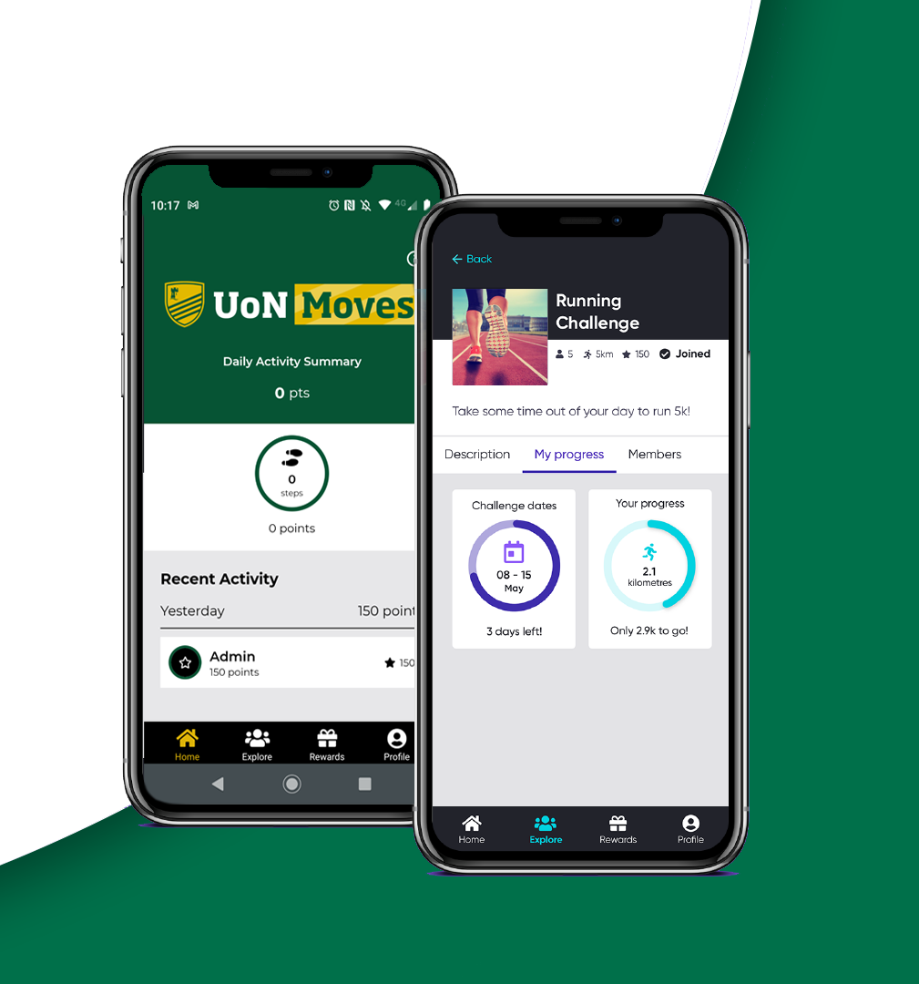 UoN Moves is an app that tracks and rewards you for the physical activity you do. Simply connect your physical activity tracking app or wearable device to your Moves account and away you go. For every step, mile or metre you walk, run, cycle or swim, you'll earn points that you can redeem for a range of rewards and get involved in challenges to suit every ability level!