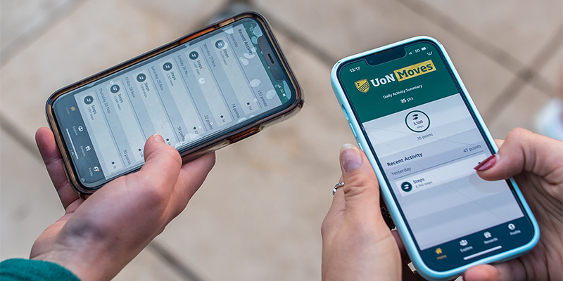 The University of Nottingham Moves app is a free app for University students and staff. You can track your activity - steps, running, cycling and swimming - to gain Moves points. Redeem your points for a range of fantastic rewards from University clothing to sports massages!