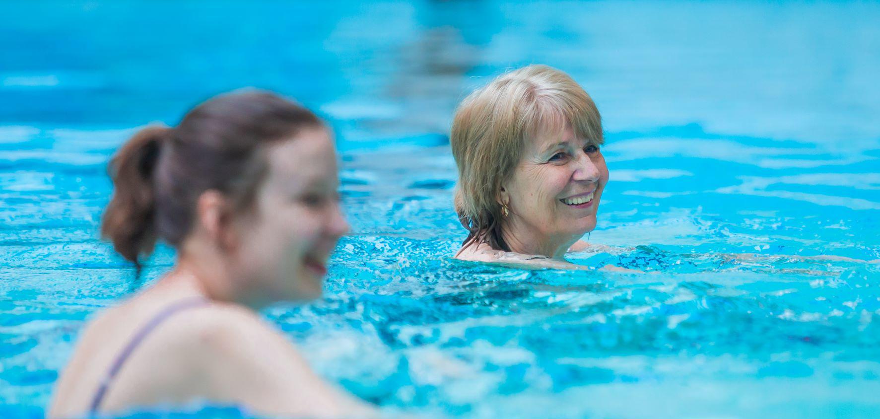Two females enjoying a class in our swimming pool. Public, friends, family and associate