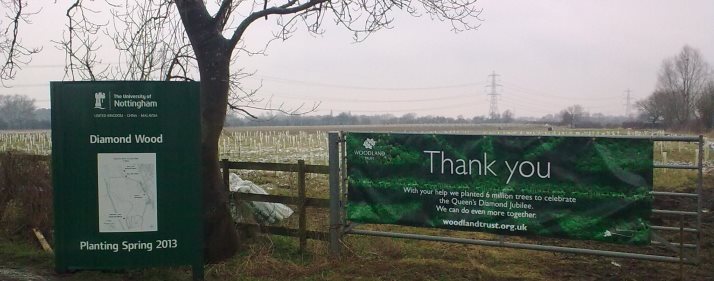 The Woodland Trust’s Jubilee Woods project aimed to plant six million trees in honour of Her Majesty The Queen’s 2012 Diamond Jubilee, creating beautiful new woodland as a lasting legacy. Sixty woods were created across the country, with the University donating land on two sites near Sutton Bonington.