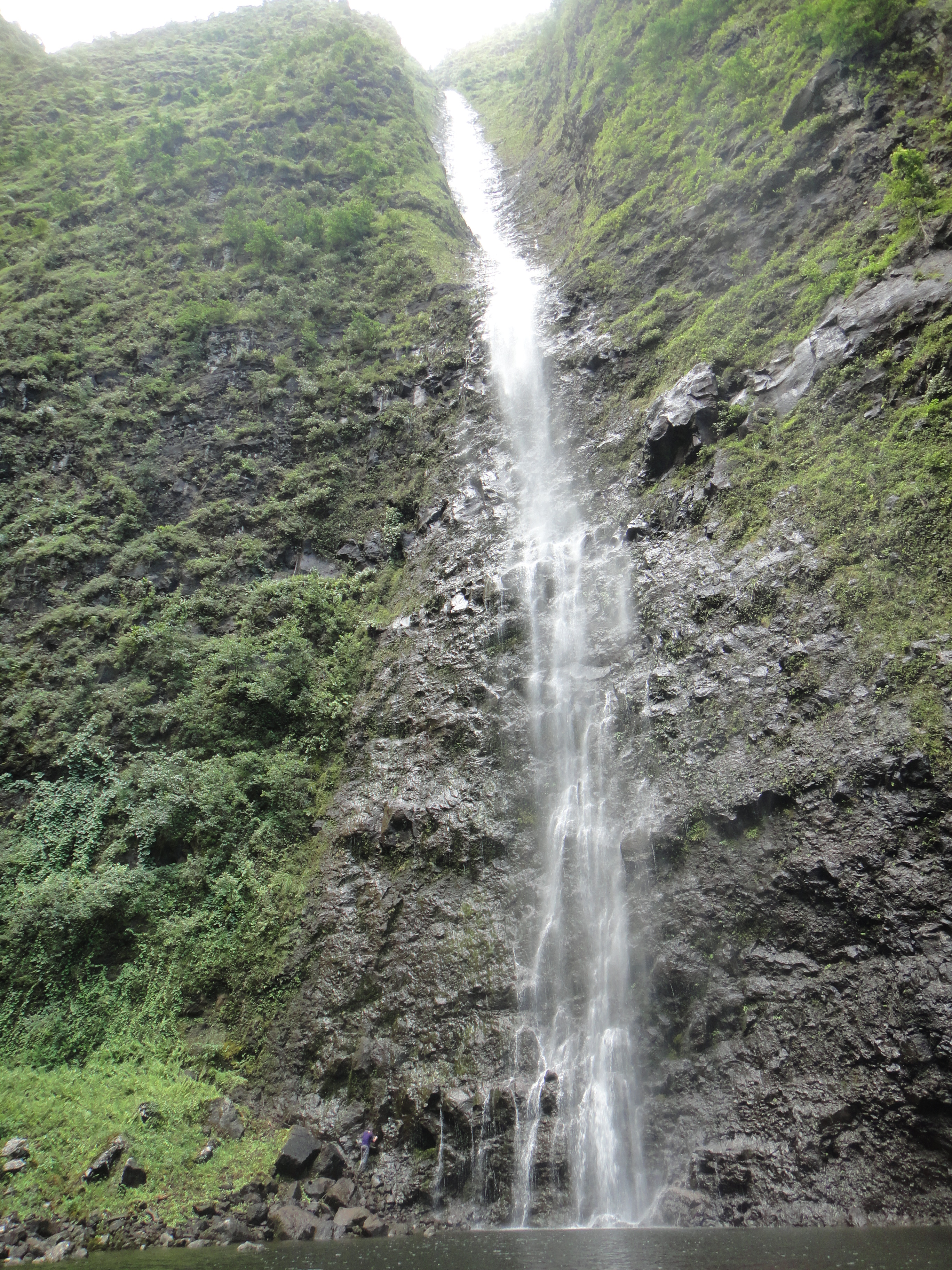 High mountain waterfall on Kauai. For scale, Angus is bottom left in a purple t-shirt.
