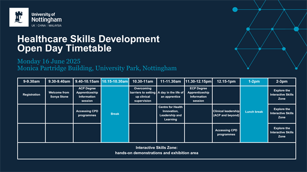 Explore a variety of information sessions, interactive exhibition zone and networking opportunities and discover the opportunities available at the University of Nottingham for healthcare professionals to advance skills and develop their career. This event is aimed at trust leads, primary care leads, healthcare workforce development professionals or healthcare professionals looking to develop their skills.